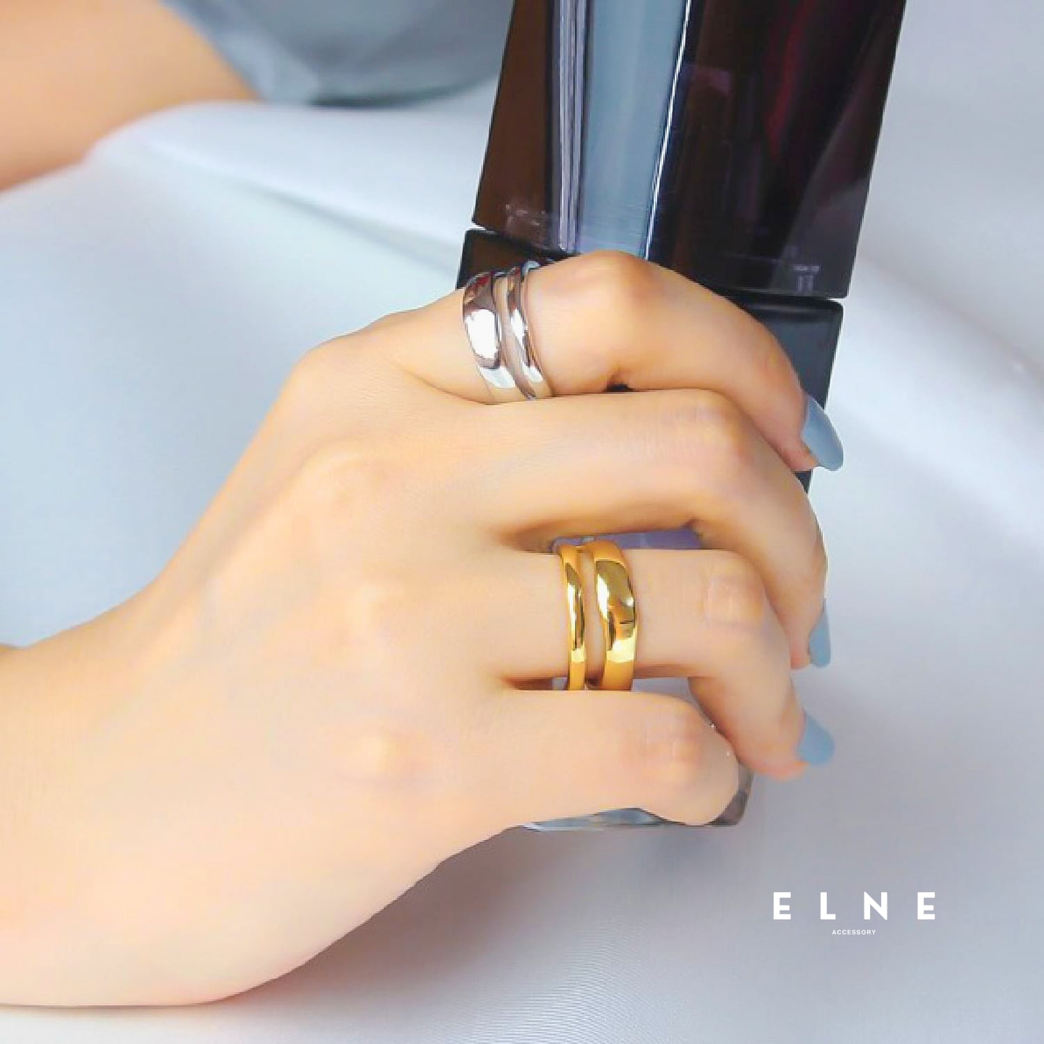 他のリングとの重ね付けも楽しめる