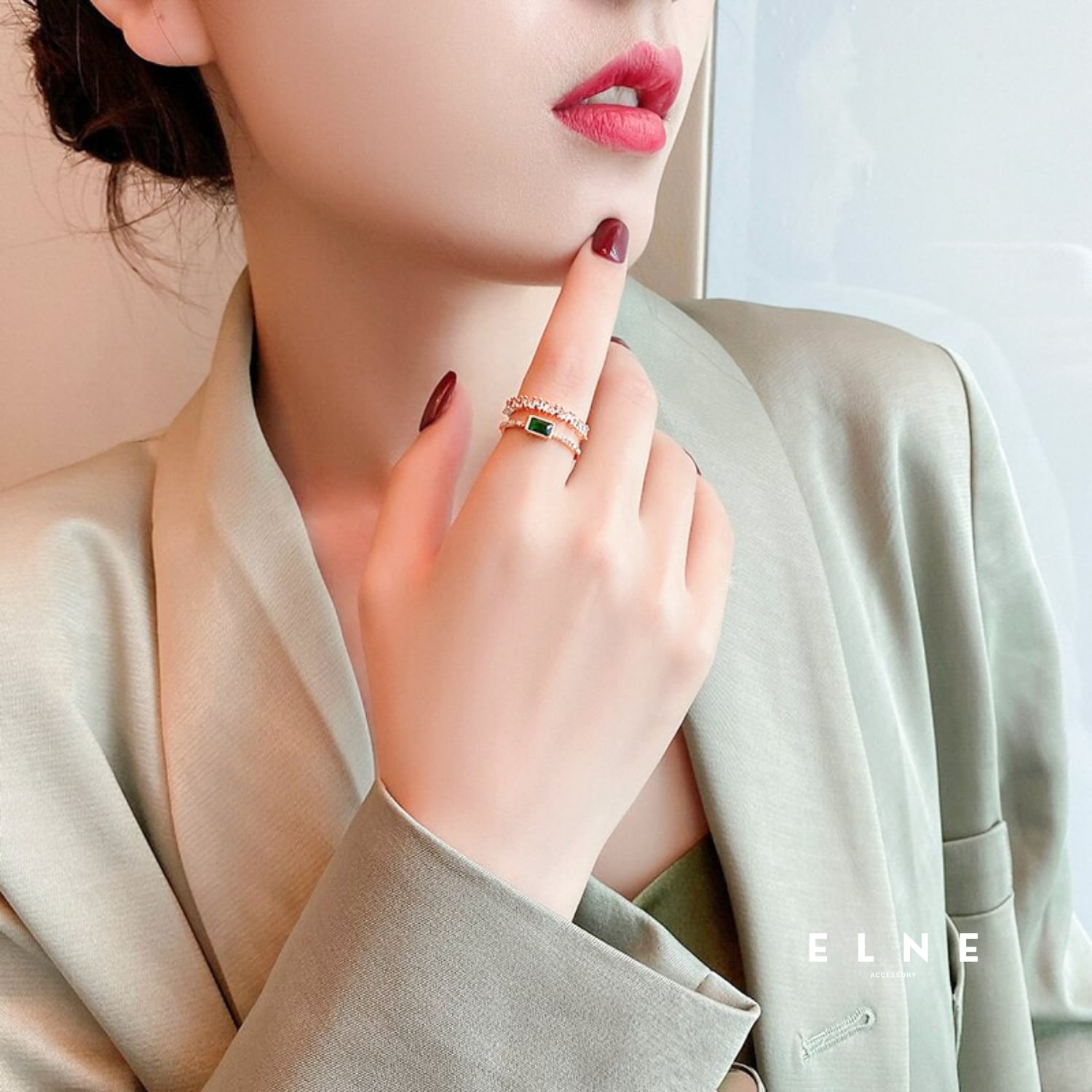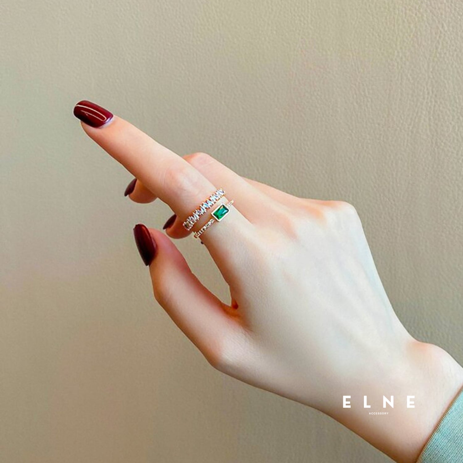 繊細な輝きと洗練されたカラーが指先を美しく彩る、レイヤードデザインリング。