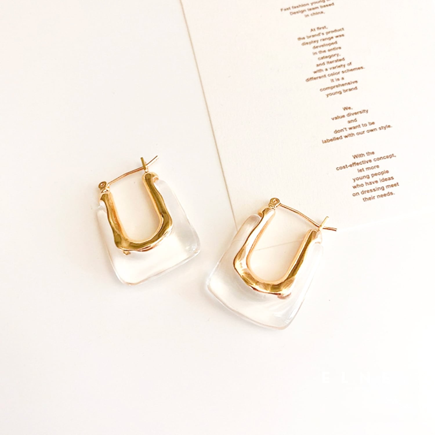 透明感のあるクリアプレートとゴールドフープを組み合わせた、洗練されたデザインピアス。