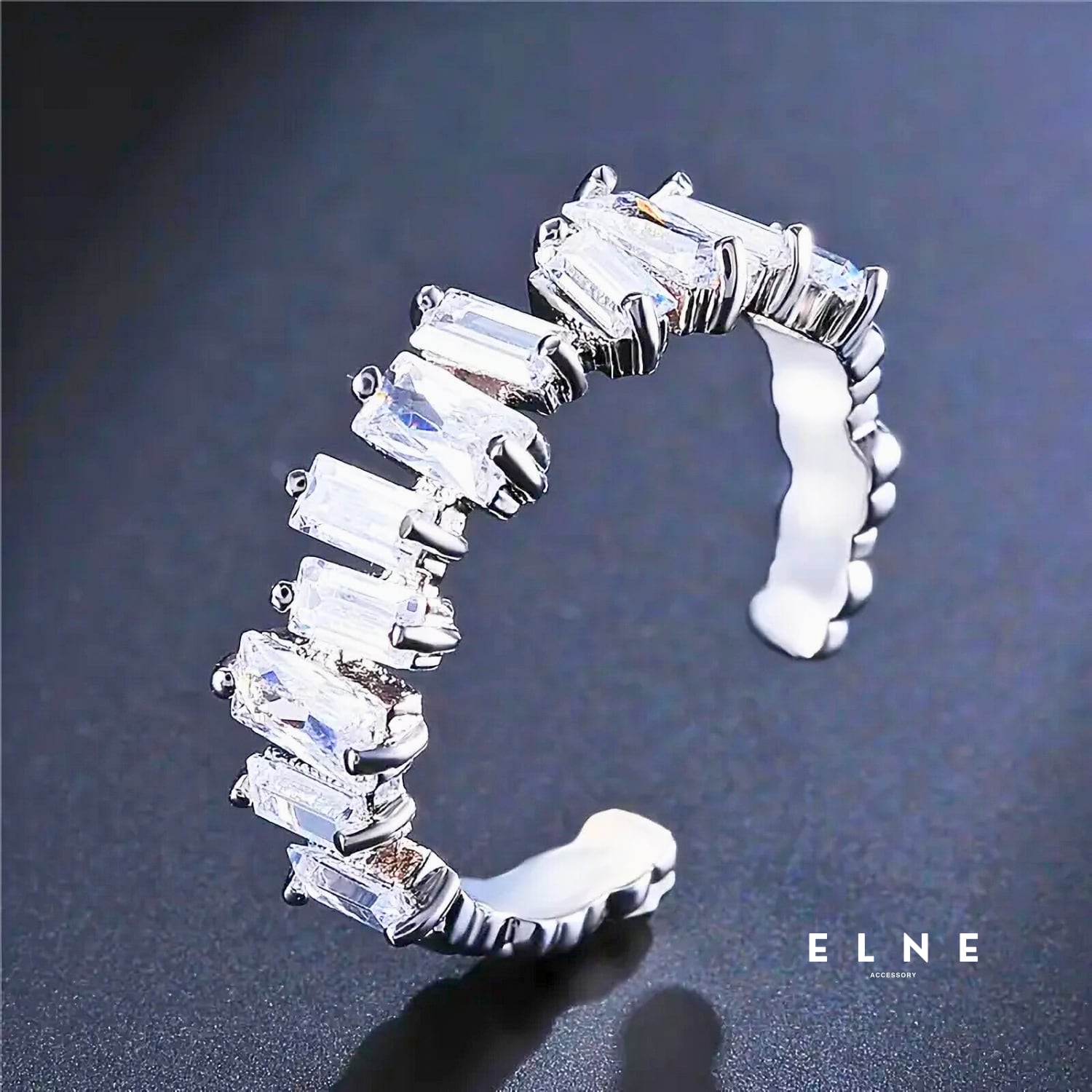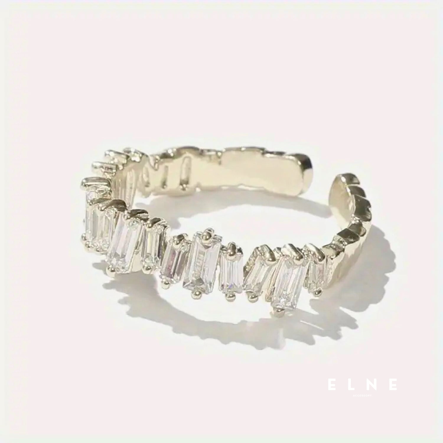 シャープな輝きが指先を美しく引き立てる、バゲットカットデザインのリング。